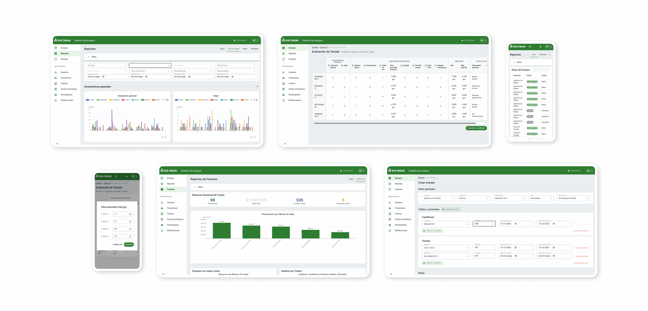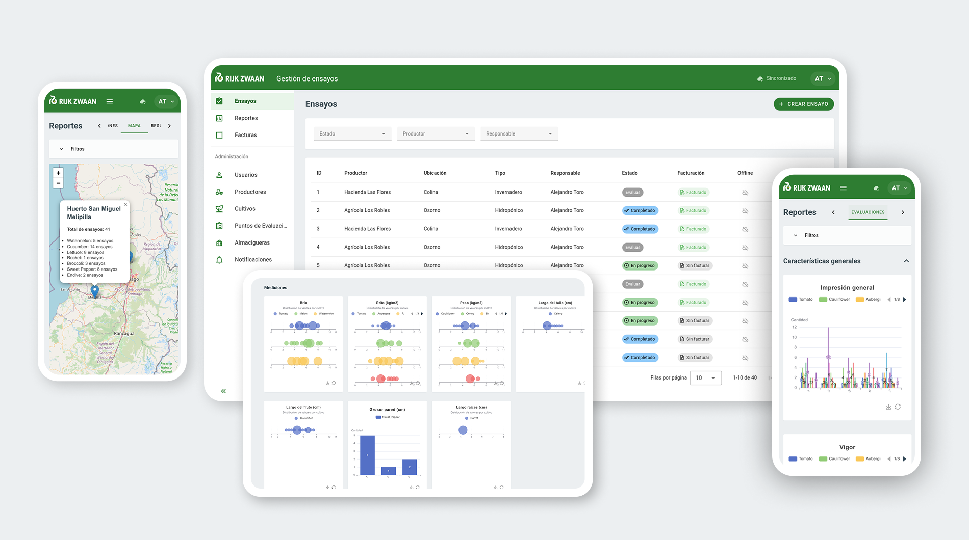 Based on this, the goal was to develop a web platform to centralize trials, evaluations, costs, reports, and notifications. We aimed to capture structured field data (including photos and videos), support operation with or without internet connectivity, and generate comparative analyses to facilitate resource and task planning for upcoming seasons.